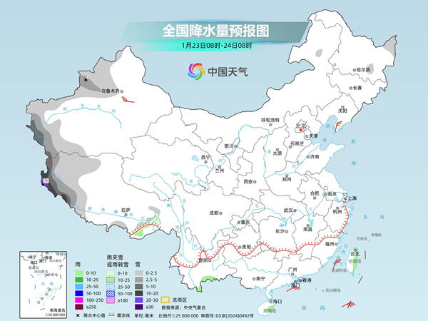 明天,新疆西部、西藏西部等地部分地区有小到中雪或雨夹雪,其中,新疆南疆西部山区、西藏西部等地部分地区有大到暴雪,局地大暴雪。云南南部、海南岛东部、台湾岛东部等地部分地区有小雨。